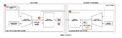 安全認證IC中,基于SHA-256的產品支持基于共享密鑰的安全認證(圖3),而基于ECDSA的IC使用私鑰/公鑰對(圖4)。除加密引擎外,這些產品擁有板載EEPROM存儲器。該存儲器是可配置的,可用于儲存經過安全認證的用戶數據,例如傳感器的校準信息。