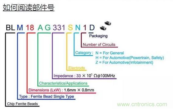 下圖以型號(hào)BLM18AG331SN1D為例說(shuō)明磁珠的命名規(guī)則