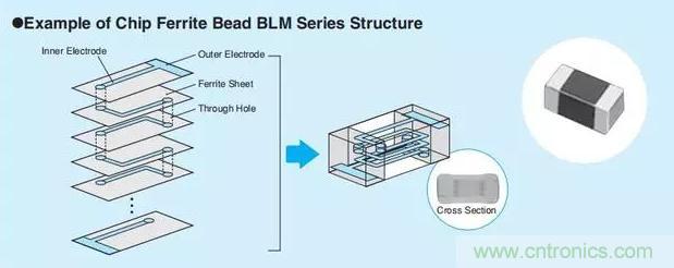 下圖為片狀鐵氧體磁珠的典型結(jié)構(gòu)。在原始鐵氧體片層之間形成線(xiàn)圈圖案,并且通過(guò)集成和燒制的過(guò)程,產(chǎn)生三維線(xiàn)圈結(jié)構(gòu)。