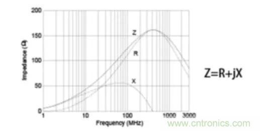 下圖顯示片狀鐵氧體磁珠的阻抗頻率特性的示例。所涉及的基本原理如下:隨著頻率上升,阻抗隨著電感器的增加而成比例增加,因此通過(guò)在電路中串聯(lián)連接這些磁珠,它們起到低通濾波器的作用。對(duì)于常規(guī)電感器,阻抗(Z)值中的主要特征是電抗分量(X)。