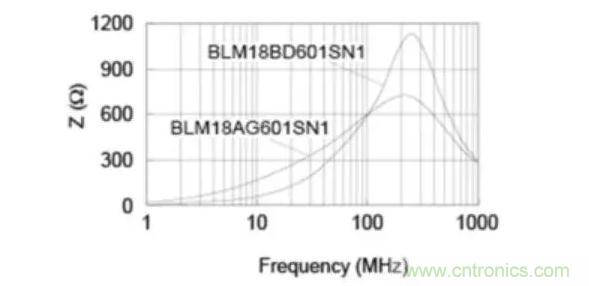 下圖顯示了曲線(xiàn)變化的示例。BLM18AG601SN1和BLM18BD601SN1都是片狀鐵氧體磁珠,在100 MHz時(shí)阻抗值為600Ω,但BLM18BD601SN1具有更尖銳的阻抗曲線(xiàn),而B(niǎo)LM18AG601SN1的曲線(xiàn)上升更為平緩。