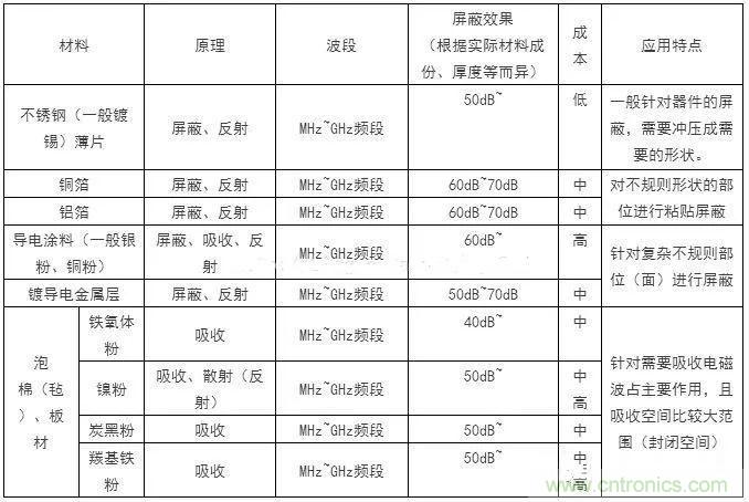 不銹鋼、銅箔、鋁箔、導(dǎo)電涂料、電磁波吸收材料(鐵氧體、鎳粉、碳黑、羰基鐵等)。