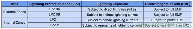 IEC/BS EN 62305避雷防護標準將雷擊風險分為以下三類:直接雷擊;間接雷擊;以及雷擊造成的電磁能量。如表1所示,在避雷防護規(guī)劃中,需要將各區(qū)域劃分為高風險區(qū)域(或稱避雷防護區(qū)域)以及雷擊潛在損害區(qū)域。上述標準將雷擊可能導致的損害分為以下三類:1)活體傷害;2)結(jié)構(gòu)的物理性損壞;3)內(nèi)部系統(tǒng)的失效。一般而言,對于任何可能給人類造成傷害的事物,均須設(shè)置層層預防措施。舉例而言,為了保障內(nèi)部人員的生命安全,醫(yī)院需要在外部結(jié)構(gòu)和內(nèi)部設(shè)備兩個層面設(shè)置大量的緩沖設(shè)施。