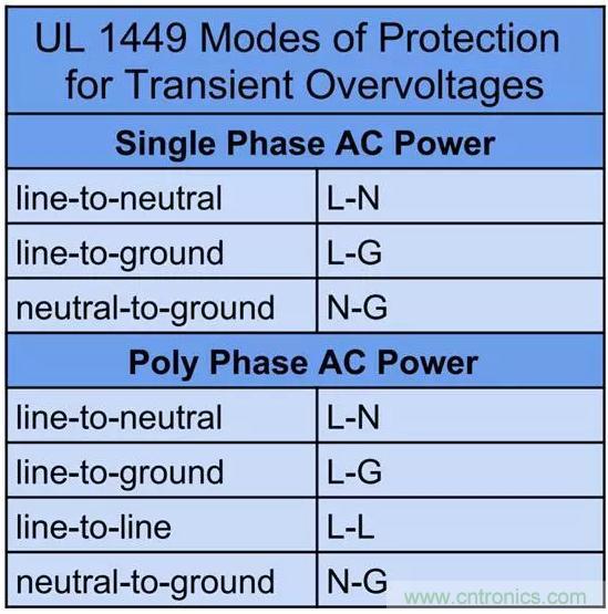 美國保險商實驗室(Underwriter’s Laboratory)所列的數(shù)種避雷防護標準主要針對浪涌保護中采用的設(shè)備(見表2)。其中,浪涌保護器件標準UL1449規(guī)定了瞬態(tài)電壓電氣路徑在各種系統(tǒng)供電方式下所需采取的保護模式。