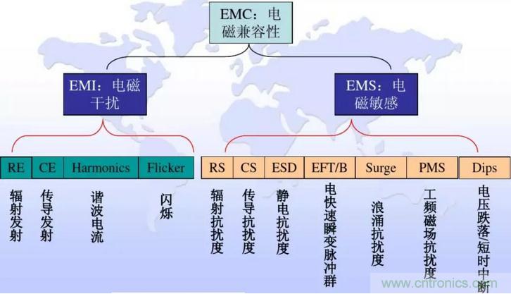 電磁兼容性(EMC)是指設備或系統在電磁環境中符合要求運行并不對其環境中的任何設備產生無法忍受的電磁干擾能力,電磁兼容(EMC)包含電磁干擾(EMI)和電磁抗擾度(EMS)。其包含的測試項目如圖1所示。