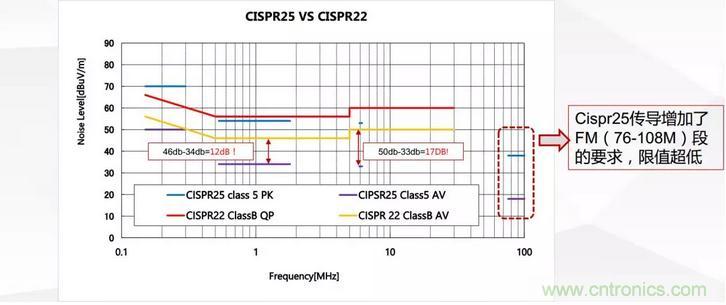 歷史上普遍接受的國際電磁干擾標準是CISPR-22,美國的電磁干擾標準是FCC,CISPR-22與FCC有所不同,但一般來說如果電源符合CISPR-22標準,那么它也符合FCC標準。總之CISPR-22標準已經成為全世界都遵守的基本標準。汽車上的電磁干擾標準是CISPR-25,相對CISPR22來說CISPR-25標準限制值更低并且額外對FM頻段做了很嚴的限制要求。具體傳導測試限制要求如圖2所示。