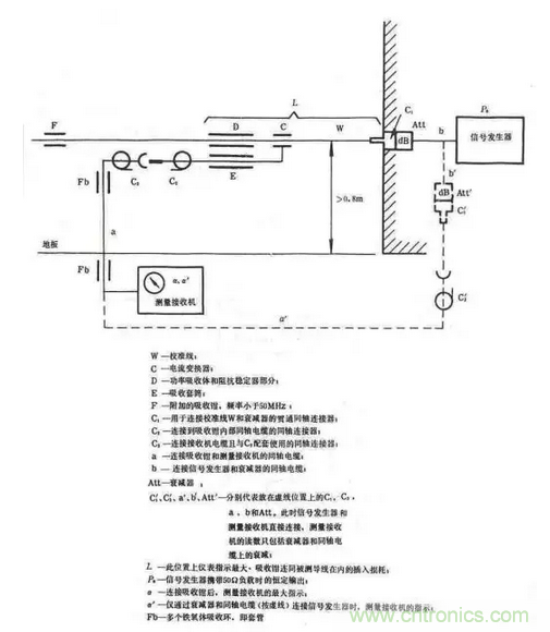 其中C是電流探頭,包括鐵氧體環(huán)和探測線圈,作用是測量電源線上的騷擾共模電流。D是鐵氧體環(huán)組,作為騷擾共模電流的穩(wěn)定負載,吸收騷擾功率,并用于隔離EUT和電網(wǎng)。如果在50MHz以下鐵氧體環(huán)組D不能充分起到射頻隔離作用,則應(yīng)在電網(wǎng)端再加一個輔助吸收鉗F,它也是由鐵氧體環(huán)組成。E也是鐵氧體環(huán)組,用于吸收外場在電流探頭引出電纜上產(chǎn)生的共模電流,以免影響測量結(jié)果。測量布置如圖19(b)所示,測試應(yīng)在屏蔽室內(nèi)進行,電源線長度應(yīng)大于6m,即大于30MHz的半波長加上吸收鉗的長度。對于每一個測試頻率點,吸收鉗都應(yīng)沿著電源線移動,找出最大值,因為共模電流在導線上是以駐波形式出現(xiàn)的。功率吸收鉗測量系統(tǒng)應(yīng)事前進行校準,得到修正因子—頻率曲線。校準布置如圖20所示。