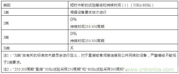 表2:短時中斷試驗優先采用的試驗等級和持續時間