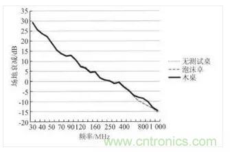 所以,當(dāng)電波暗室使用木桌或其他較大介電常數(shù)材質(zhì)制作的試驗桌等輔助設(shè)施時,會使場地衰減AN 增大而導(dǎo)致接收機(jī)測得的電場強(qiáng)度減小,使測試結(jié)果造成差異。試驗桌等輔助設(shè)備是試驗場地有效性中不可分割的一部分,因此建議,在選擇暗室輔助設(shè)施時選擇介電常數(shù)小的材質(zhì),并進(jìn)行場地衰減的測量比較,以保障各暗室測量結(jié)果的一致性。