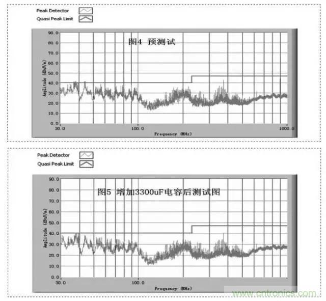 現場測試時,在模塊電源VH2處增加一個3300uf的電解電容,發現對輻射的抑制作用明顯,特別是在30MHz至1000MHz區間對毛刺和能量頻譜的抑制作用明顯(見圖4和圖5)。電容值越大,對毛刺尖峰的抑制作用越明顯,濾波后的曲線越平滑。當然,電容值的選擇需要按照實際的設計要求來定。