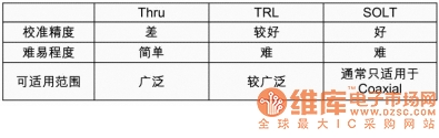 在三種常用的測試儀器中,網絡分析儀的校準方法最為嚴謹,頻譜分析儀次之,示波器的校準方法最為簡單。因此,我們這里主要討論網絡分析儀的校準方法。網絡分析儀常用的校準方法有三種,thru、trl和solt。三種方法的特性如表1所示。