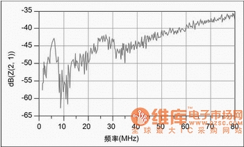 測試電源系統性能時,通常使用網絡分析儀,測試對象是電源系統的self-impedance和transfer-impedance。一般情況下,電源系統的阻抗均遠小于網絡分析儀系統阻抗(50歐姆),所以測試時只要做直通校準就可以了,利用公式s21=z/25就可以得到電源系統的阻抗。圖2所示為某單板電源阻抗特性。