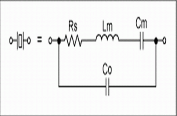 晶體的等效電路見圖1。圖中包括了動態元件:電阻Rs、電感Lm、電容Cm和并聯電容Co。這些動態元件決定了晶體的串聯諧振頻率和諧振器的Q值。并聯電容Co是晶體電極、管殼和引腿作用的結果。
