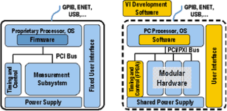圖1、傳統儀器(左圖)和基于軟件的虛擬儀器(右圖)具有許多相同的結構組件,但是在體系結構原理上完全不同
