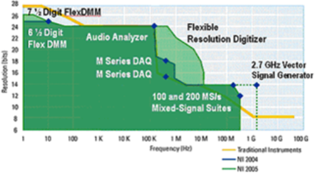 基本上,虛擬儀器系統是基于軟件的,所以如果只要是可以數字化的東西,就可以對它進行測量。因此,測量硬件可在通過兩根坐標軸進行評估,即分辨率(位)和頻率。參考下圖可以看出虛擬儀器硬件測量性能與傳統儀器的比較。NI的目標就是將曲線在頻率和分辨率上延伸并且在曲線內進行不斷推陳出新。