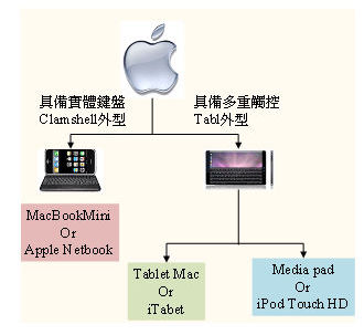 “蘋果公司到底會不會推出上網本?”已成各方矚目焦點。拓墣產業研究所(TRI)判斷,蘋果公司在短期(一年內)推出Media Pad平板式優質上網本或iPod Touch HD的可能性最大,在中期(兩年內)推出標準掀蓋式MacBook Mini,將是在計算機逐漸走向低價化時,蘋果公司不得不走的路。