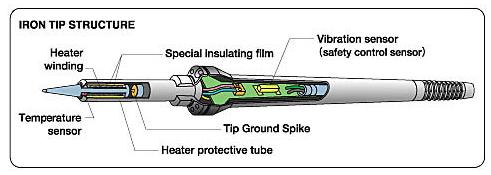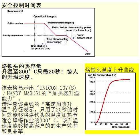 - 具備節能功能。當一段時間不使用烙鐵時加熱器溫度會自動降低至設定的作業準備溫度。 ( 當拿起烙鐵手柄時溫度會自動上升恢復至設定的作業溫度 )
