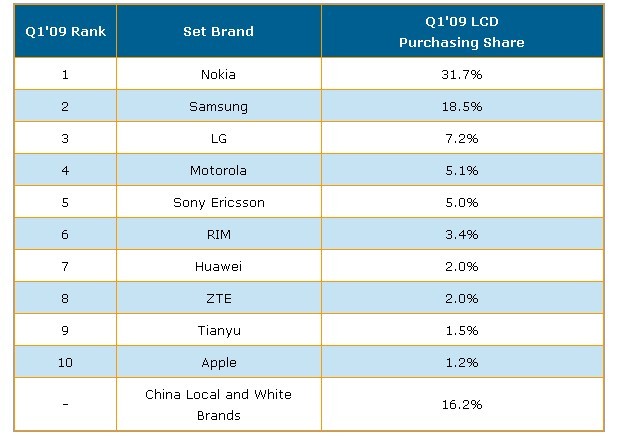 表一 2009年第一季手機品牌廠商按面板出貨量排名