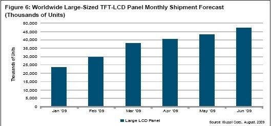 2009年整個(gè)第二季度,全球大尺寸LCD面板出貨量比第一季度上升了43%,比2008年第二季度上升了12%。這應(yīng)歸因于全球經(jīng)濟(jì)好轉(zhuǎn)、中國市場需求旺盛、新型號的推出、向16:9面板的轉(zhuǎn)變、以及越來越多地使用LED背光技術(shù)。