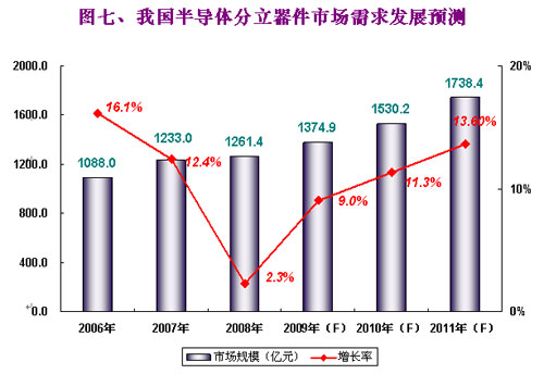 2008年我國分立器件產(chǎn)銷的一大亮點主要得益于全球電子整機對節(jié)能、環(huán)保需求的不斷增長,這一方面帶動了分立器件產(chǎn)品的需求增長,另一方面也帶動了市場產(chǎn)品結構的快速升級。銷售額在LED產(chǎn)業(yè)大幅增長的帶動下仍增長了12.3%,在二極管、三極管增速相對平穩(wěn)之時,而以MOSFET和IGBT為主的功率晶體管的廣泛應用于PC、筆記本電腦、計算機電源配件、液晶電視等而得到提升。2008年我國分立器件產(chǎn)量達到2461.13億只,同比下降1.1%;2008年我國分立器件銷售額達到937.8億元,同比增長12.3%。(CSIA、CCID年度報告)