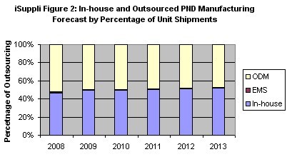 iSuppli公司對2008-2013年內部和外包PND制造業務的預測。
