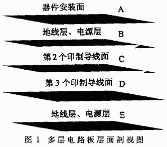 采用多層布線方式,電源、地線和信號分別占有獨(dú)立的層面(如圖1所示),這樣由整個(gè)層面構(gòu)成的電源線和接地線阻抗相當(dāng)?shù)汀k娐钒宓姆植茧娙萦筛鲗又g的距離和介電系數(shù)來決定,約為10~1000pF/cm2。圖1中的E層上下表面經(jīng)過絕緣處理,既能預(yù)防線路板向外輻射噪聲,又能防止線路板接受外來噪聲;同時(shí),電源線被密封在板內(nèi),幾乎不接受任何外來噪聲,而且內(nèi)部幾個(gè)供電面之間有很大的靜電電容,形成阻抗極低的供電線路,極大地提高了抗噪性能。