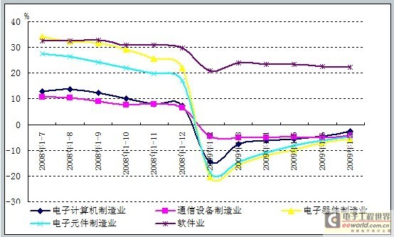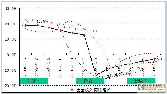 2008年三季度,受全球金融危機的影響,中國電子信息產業出現下滑趨勢。7-8月,主營收入增長率下滑0.2個百分點,8-9月,增長率下滑1.3個百分點。進入第四季度,下滑幅度開始增大,9-10月,增長率下滑了1.9個百分點,至2009年2月,主營收入增長率跌至最低點。從2009年2月電子信息產業振興規劃獲得通過,4月振興規劃正式發布到7月期間,伴隨著“家電下鄉”,“汽車下鄉”、調整出口退稅稅率等政策相繼實施,振興規劃對電子信息產業的提振效應開始顯現。賽迪顧問研究數據顯示,從2009年4月起,電子信息產業經濟運行開始出現企穩跡象,主營收入降幅趨緩,并逐漸開始走出低谷。