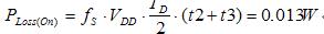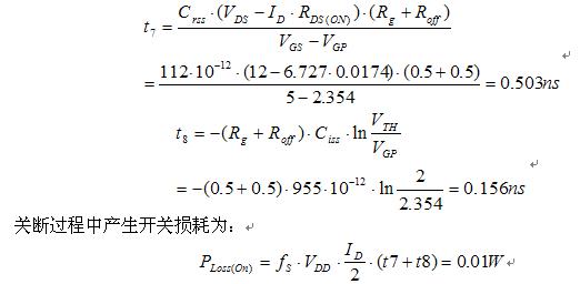 MOSFET開通損耗主要發(fā)生t2和t3時間段。下面以一個具體的實例下計算。輸入電壓12V,輸出電壓3.3V/6A,開關頻率350kHz,PWM柵極驅動器電壓為5V,導通電阻1.5Ohm,關斷的下拉電阻為0.5Ohm,所用的MOSFET為AO4468,具體參數(shù)如下:Ciss= 955pF,Coss= 145pF,Crss= 112pF,Rg= 0.5Ohm;當VGS= 4.5V,Qg= 9nC;當VGS=10V,Qg= 17nC,Qgd= 4.7nC,Qgs= 3.4nC;當VGS=5V且ID=11.6A,跨導gFS= 19S;當VDS=VGS且ID=250uA,,VTH= 2V;當VGS= 4.5V且ID=10A,RDS(ON)=17.4mOhm。
