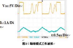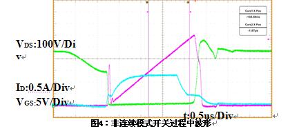 注意到圖1是基于連續(xù)電流模式下所得到的波形,對于非連續(xù)模式,由于開通前的電流為0,所以,除了Coss放電產(chǎn)生的功耗外,沒有開關的損耗,即非連續(xù)模式下開通損耗為0。但在實際的檢測中,非連續(xù)模式下仍然可以看到VGS有米勒平臺,這主要是由于Coss的放電電流產(chǎn)生的。Coss放電快,持續(xù)的時間短,這樣電流迅速降低,由于VGS和ID的受轉移特性的約束,所以當電流突然降低時,VGS也會降低,VGS波形前沿的米勒平臺處產(chǎn)生一個下降的凹坑,并伴隨著振蕩。