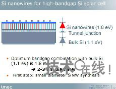 IMEC的目標是實現(xiàn)在硅底板上形成硅納米線的太陽能電池。硅底板的帶隙為1.1eV,而利用量子效應的硅納米線為1.7~1.8eV。組合帶隙不同的硅底板和硅納米線,可期待提高效率。Poortmans表示:“如果這一設想能夠實現(xiàn),轉換效率將達到約33%”。