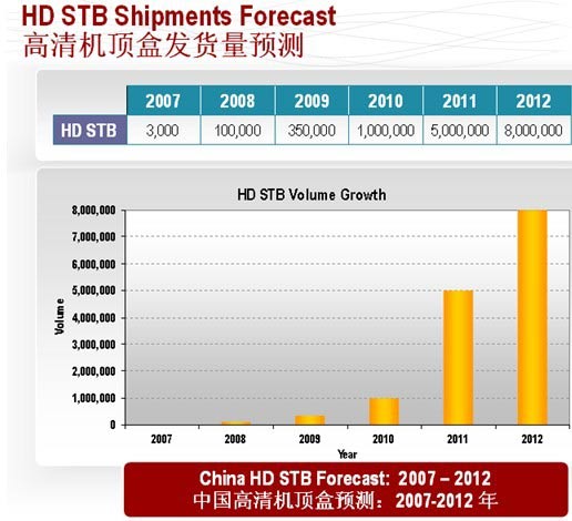 此外,博通特別對高清機頂盒市場做了分析。寬帶通訊事業(yè)部資深市場總監(jiān)JohnGleiter說,由于政府大力推進高清內(nèi)容進入消費者市場,預(yù)示著中國的高清機頂盒產(chǎn)業(yè)正式破冰啟航。與此同時,廣電總局要求的九套免費高標(biāo)清同播的衛(wèi)視節(jié)目將從現(xiàn)在開始不斷完善。在總局內(nèi)容高清化的時間表中,到2010年,這五套衛(wèi)視的所有節(jié)目都需實現(xiàn)高、標(biāo)清同播,這就打開了之前制約高清電視發(fā)展的內(nèi)容瓶頸。而高清平板電視機的普及更為高清大發(fā)展迎來了契機。目前70%的平板電視機是高清或全高清兼容的,這就意味著購買高清電視機的消費者將成為運營商挖掘的潛在用戶。單一的數(shù)字化整轉(zhuǎn)運營商需要大量的成本投入,現(xiàn)在很多運營商將未來的盈利模式都鎖定在高清和互動兩個方面,所以未來可能有更多的運營商考慮“高清轉(zhuǎn)換”,這就帶來了有線高清機頂盒將在2010年大幅增長的趨勢。In-Stat預(yù)測,到2010年末將交付50萬臺先進的有線電視機頂盒,這些機頂盒都將具有高清處理能力。