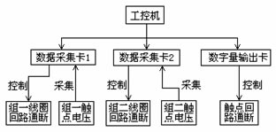 需要注意的是,當(dāng)觸點(diǎn)電壓為交流信號(hào)時(shí),為了保證電壓有效值的計(jì)算精度,采集卡在一個(gè)工頻周期內(nèi)要完成16個(gè)采集通道至少320次的AD轉(zhuǎn)換,這就要求采集卡的采集速率非常快,本裝置采用的是研華的PCL-818HG。每塊采集卡還提供了一個(gè)20-PIN數(shù)字輸出口,用來控制試品線圈回路的通斷電。試品觸點(diǎn)回路采用一塊多通道的數(shù)字量輸出卡,通過固態(tài)繼電器實(shí)現(xiàn)對(duì)兩組試品觸點(diǎn)回路的通斷電控制。繼電器可靠性檢測(cè)裝置的結(jié)構(gòu)框圖如圖1所示。