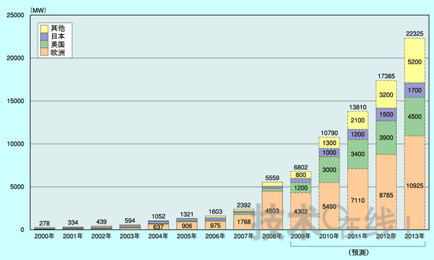 - 2013年歐洲市場的擴大率將為2008年的2.4倍,達到1萬925MW