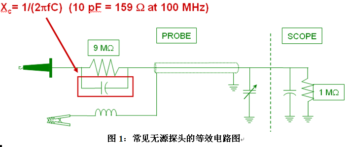 從無源探頭的原理來看,如圖1所示為常見的無源探頭的簡化電路圖,通常示波器標配的無源探頭的直流輸入電阻為10兆歐(探頭的9兆歐與示波器前端1兆歐串聯),輸入電容為10pf左右,與9兆歐電阻并聯。當待測試信號的頻率較高時,容抗隨著頻率升高而減小,所以無源探頭整體的輸入阻抗變小,當頻率為100MHz時,輸入阻抗為159歐。