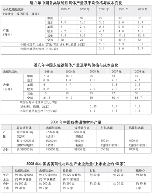 中國(guó)磁性材料產(chǎn)量以15%以上的年增長(zhǎng)率發(fā)展,到2008年,中國(guó)軟磁鐵氧體產(chǎn)量已達(dá)32萬(wàn)噸,永磁鐵氧體45萬(wàn)噸,燒結(jié)釹鐵硼永磁5萬(wàn)噸,粘結(jié)釹鐵硼永磁0.45萬(wàn)噸,釤鈷永磁0.65萬(wàn)噸,鋁鎳鈷永磁0.4萬(wàn)噸。