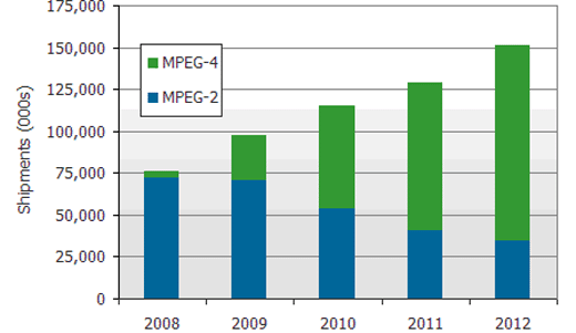 圖二 2008到2012 MPEG-4與MPEG-2數(shù)字電視出貨比例