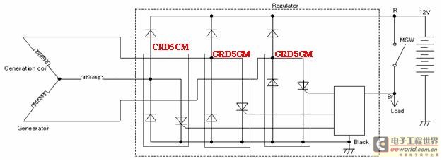 兩輪機(jī)動車和通用電池的引擎在發(fā)電機(jī)與電池之間使用了穩(wěn)壓器,用以防止在高于電池存儲電壓值的電壓下產(chǎn)生的電流。它們通過開/關(guān)來自于發(fā)電機(jī)的電流來調(diào)節(jié)電壓。三相穩(wěn)壓器模塊通常由3組晶閘管和二極管組成,每一組都有它們自己的封裝。(■ 見應(yīng)用電路實(shí)例。)