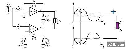 橋接式(BTL)放大器如(圖二)所示,由兩個單端式(Single-end)放大器以相差180組成,故其增益為