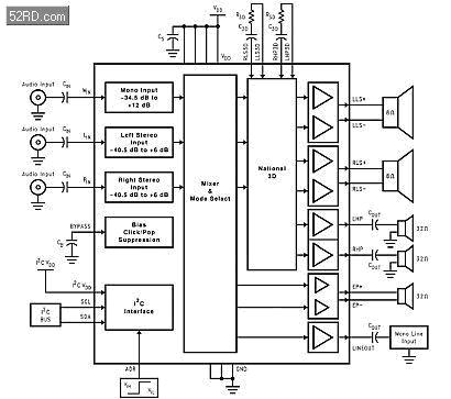 ●后級放大器:包括一立體聲揚聲器(喇叭)驅動器,一立體聲耳機驅動器,一單聲道耳機放大器(earpiece),和一用于免持聽筒之線路輸出(lineout),例如汽車的免持聽筒電話輸出。