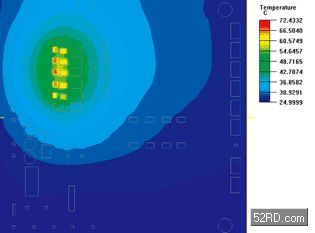 圖1b:原始設計中,在均勻熱流時PCB上表面的溫度分布情況。