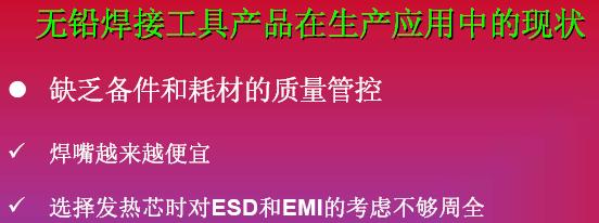 無鉛焊臺的研發(fā)都是歐美公司在進(jìn)行,但應(yīng)用是全球化。尤其是中國,非常多的用到無鉛焊臺的工具。我們在工業(yè)設(shè)計到工業(yè)制造有一些斷層,這同樣也存在問題,我們主要是應(yīng)用,開發(fā)是在歐美。這里面可能會存在理解上的誤區(qū),比如說盲目的追求勞動效率的提高,但是不會理解到很多無鉛焊接工藝本身的特點。
