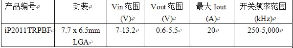 iP2010的輸入電壓范圍為7V至13.2V,輸出電壓范圍則為0.6V至5.5V,輸出電流高達30A。這個器件最高運行頻率為3MHz。在5MHz運行時,與iP2010引腳兼容的iP2011備有相同的輸入和輸出電壓范圍,但后者經過優(yōu)化,從而使最高輸出電流高達20A。通過以通用占位面積提供多種電流額定值器件,IR提供的靈活性能夠滿足不同客戶對電流水平、性能和成本的要求。