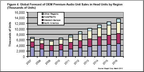 據iSuppli公司,在2009年下滑之后,全球車用高端音響系統的出貨量在2010年將以兩位數速度增長,從而為該市場在2016年翻倍鋪平道路。