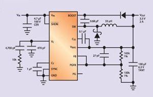 在猝發模式下,它的靜態電流低于100礎,適合輸入電壓為12V至3.3V的產品。這個器件采用厚度很薄的TSSOP封裝,熱阻非常小,適合尺寸很小的設計。最后,它使用了電流模式電路,具有良好的瞬態響應,容易補償,并且使用一種擁有專利權的電路,在占空比為任何數值時保持開關中的峰值電流恒定。它的開關頻率是固定的200kHz,此外,這個產品可以同更高的頻率同步。在整個汽車的溫度范圍內,它的穩壓性能很好,并且提供電源正常信號/復位、軟啟動和UVLO功能。這個電路是一個可靠的、高效率的降壓轉換器解決辦法,電流高達2.5A,尺寸很小,適合汽車使用。