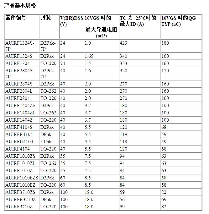 IR 亞洲區銷售副總裁潘大偉表示:“IR 這些經過優化的汽車專用MOSFET具有低導通電阻,具有寬泛的電壓和封裝。由于其表面形成了鈍化層,因而可以提高可靠性。此外,該器件的材料經過調整、優化后可達到堅固、耐用的效果。”