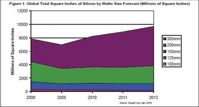 圖1所示為iSuppli公司對2008-2013年硅片面積總產(chǎn)量的預測,按晶圓尺寸細分。