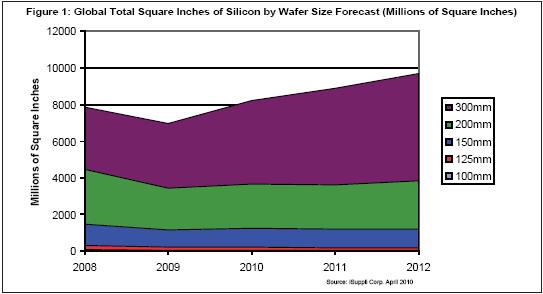 iSuppli公司預測,2013年300毫米晶圓產量將從2008年的36億平方英寸增長到61億平方英寸,復合年度增長率(CAGR)為12.4%。相比之下,200毫米晶圓將從2008年的30億平方英寸下降到27億平方英寸,復合年度增長率為負2%。