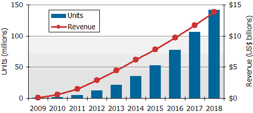 - 預估到2018年將大幅成長到1億4千200萬臺,年產值達139億美元