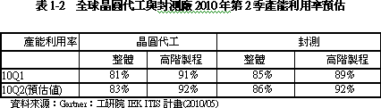 在IC制造業(yè)部分,預(yù)估2010Q2漸步入季節(jié)性需求上升期,配合產(chǎn)能逐步開出,臺灣IC制造業(yè)可望呈現(xiàn)價量齊揚(yáng)的階段,帶動臺灣IC制造業(yè)產(chǎn)值上揚(yáng),預(yù)估可較2010Q1成長6.6%,并較去年同期成長47.6%