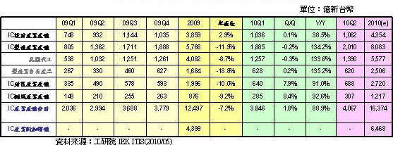 2010Q1由于全球景氣好轉(zhuǎn),再加上新興市場需求持續(xù)強(qiáng)勁,所以呈現(xiàn)淡季不淡之情況。2010年第一季臺灣整體IC產(chǎn)業(yè)產(chǎn)值(含設(shè)計、制造、封裝、測試)達(dá)新臺幣3,846億元,較上季(09Q4)成長1.8%,較去年同期(09Q1)成長88.9%。其中設(shè)計業(yè)產(chǎn)值為新臺幣1,036億元,較上季(09Q4)成長0.1%,較去年同期(09Q1)成長38.5%;制造業(yè)為新臺幣1,885億元,較上季(09Q4)衰退0.2%,較去年同期(09Q1)成長134.2%;封裝業(yè)為新臺幣640億元,較上季(09Q4)成長7.9%,較去年同期(09Q1)成長91.0%;測試業(yè)為新臺幣285億元,較上季(09Q4)成長8.4%,較去年同期(09Q1)成長92.6%。